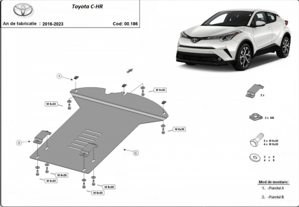 Securitate maximă pentru sistemul de evacuare al modelului Toyota C-HR (2016 - 2023) cu acest scut metalic antifurt special conceput pentru catalizator. Scutul (Cod: 00.186) reprezintă o barieră fizică de neclintit din oțel de 2 mm, oferind protecție esențială împotriva tentativelor de furt rapid, tot mai frecvente pentru acest model. Conceput special pentru a bloca accesul la componentele scumpe ale evacuării, acesta oferă liniște sufletească oricărui posesor de Toyota C-HR, în special pentru variantele Hybrid.