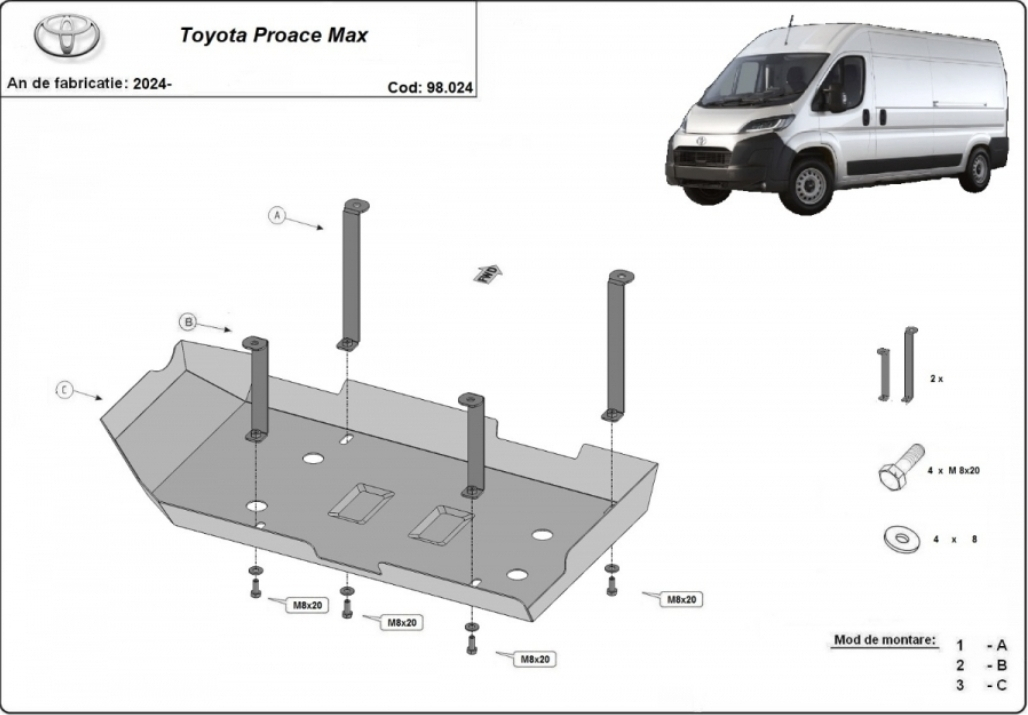 Protecție ultra-robustă din oțel de 2 milimetri, special concepută pentru sistemul de post-tratare a emisiilor al modelului Toyota Proace Max (2024 - 2026). Scutul (Cod: 98.024) reprezintă o armură dedicată care acoperă rezervorul de AdBlue, oferind siguranță maximă împotriva impacturilor sub șasiu, a resturilor de pe carosabil și a coroziunii. Acest accesoriu de 8 kilograme este o investiție strategică pentru longevitatea vehiculului dumneavoastră, protejând o componentă electronică și hidraulică extrem de sensibilă.