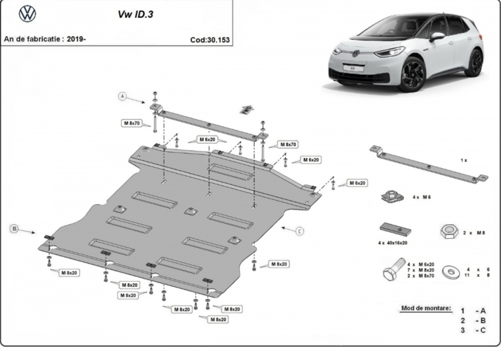 Da, designul scutului cod 30.153 este conceput să se potrivească pe platforma MEB a modelului ID.3, indiferent de capacitatea acumulatorului sau de nivelul de echipare al mașinii.